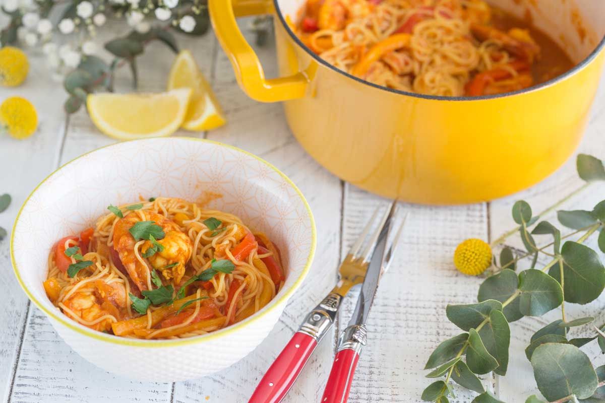 Plongeons dans la recette qui se cache dans ma superbe cocotte jaune : des vermicelles aux crevettes et poivrons! Ce plat, à la fois simple et rapide, est parfait pour illuminer vos repas.