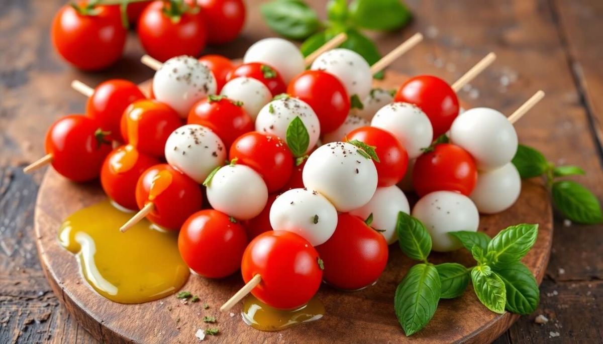 Ces brochettes de mozzarella et tomates s'inspirent de la célèbre salade caprese italienne, mettant en avant des saveurs simples et délicieuses. Idéales pour les journées ensoleillées, elles vous transportent directement en Méditerranée.