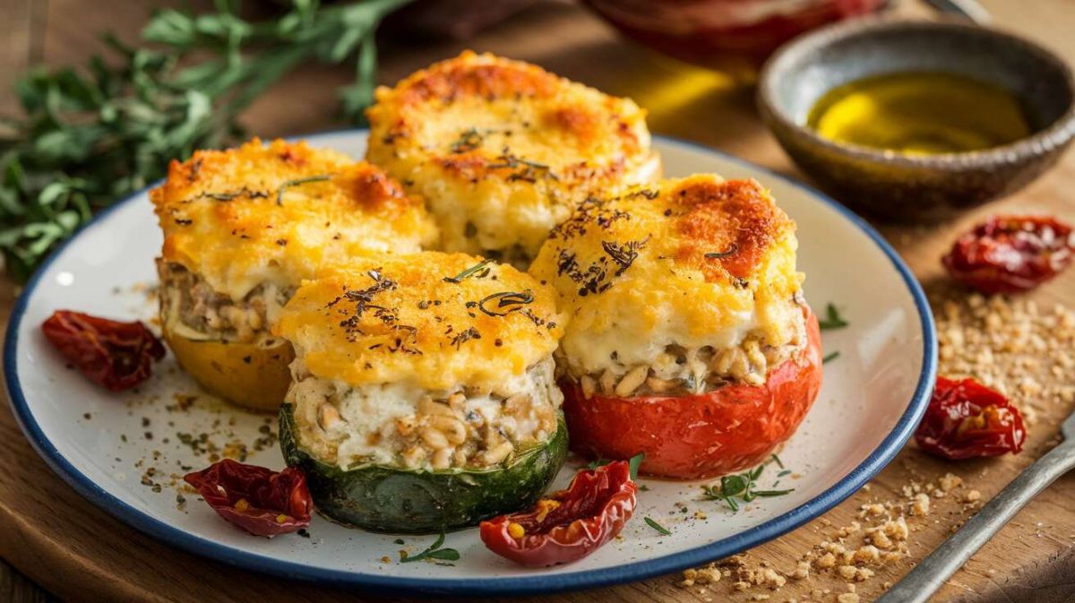 Disposez les légumes farcis dans un plat à gratin. Saupoudrez de chapelure pour un effet doré.