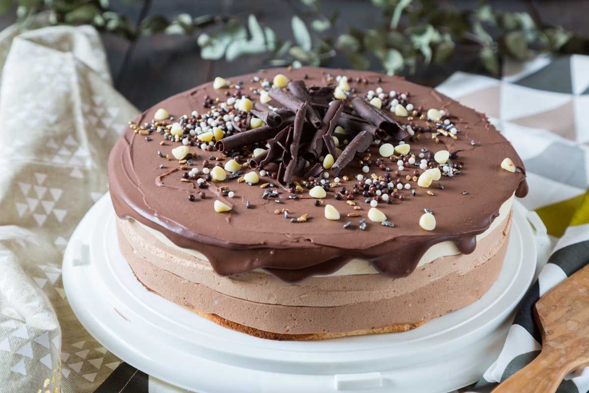 Cet entremet crémeux, alliant chocolat noir, chocolat au lait et chocolat blanc, est un incontournable pour les amateurs de sucré.