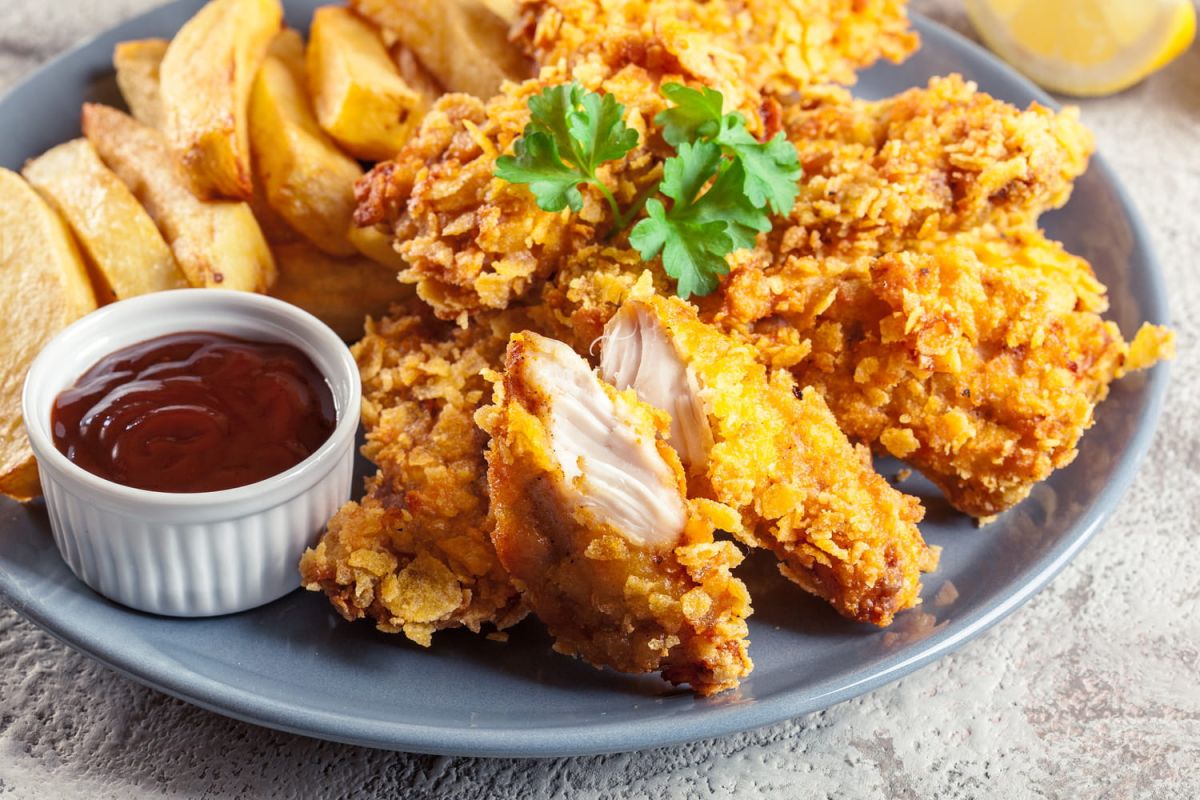 - Découpez des morceaux de poulet de 8 cm de long sur 4 cm de large. Trempez-les successivement dans la farine, les œufs battus, puis les cornflakes, en pressant bien pour que les céréales adhèrent.