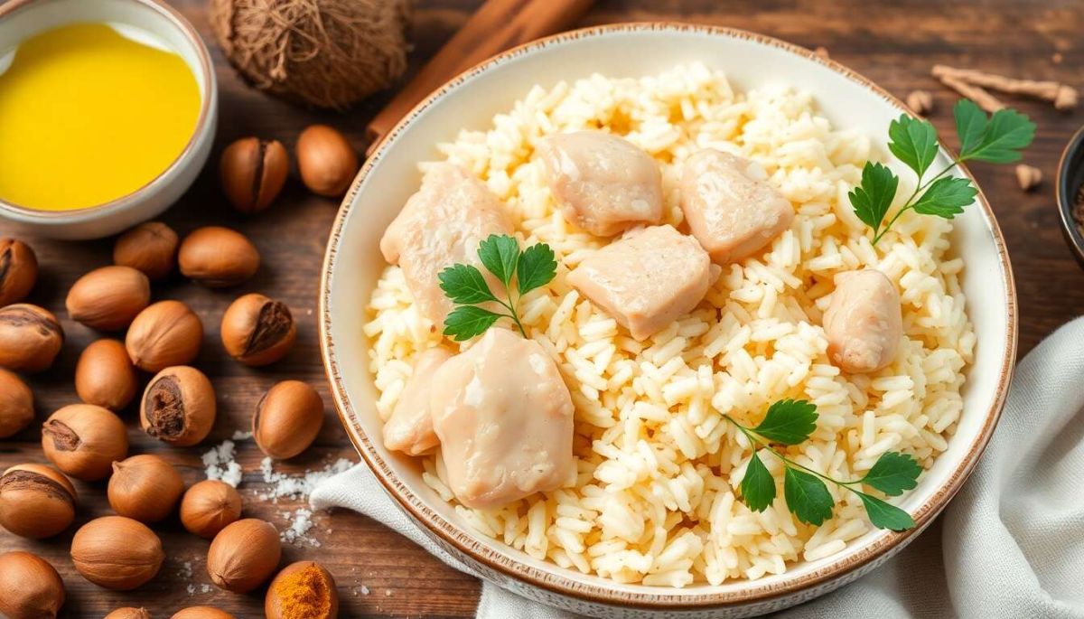 Éveillez vos papilles avec notre recette unique de poulet aux noisettes, harmonisée avec du riz délicatement parfumé à la noix de coco. Ce plat saura enchanter votre cuisine d'une fragrance douce et exotique, promettant un repas mémorable pour toute la famille.