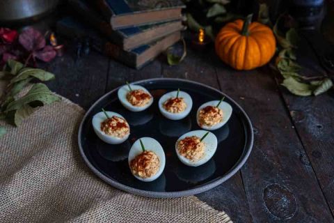 Pour garnir, remplissez les blancs des œufs avec la préparation des jaunes. Vous pouvez utiliser une poche à douille pour un rendu plus soigné. Saupoudrez d'un peu de paprika et placez un brin de romarin sur le dessus pour représenter la tige de la citrouille. Arrangez vos œufs sur un plat noir ou orange pour accentuer le thème d'Halloween et laissez place à votre créativité pour la présentation !