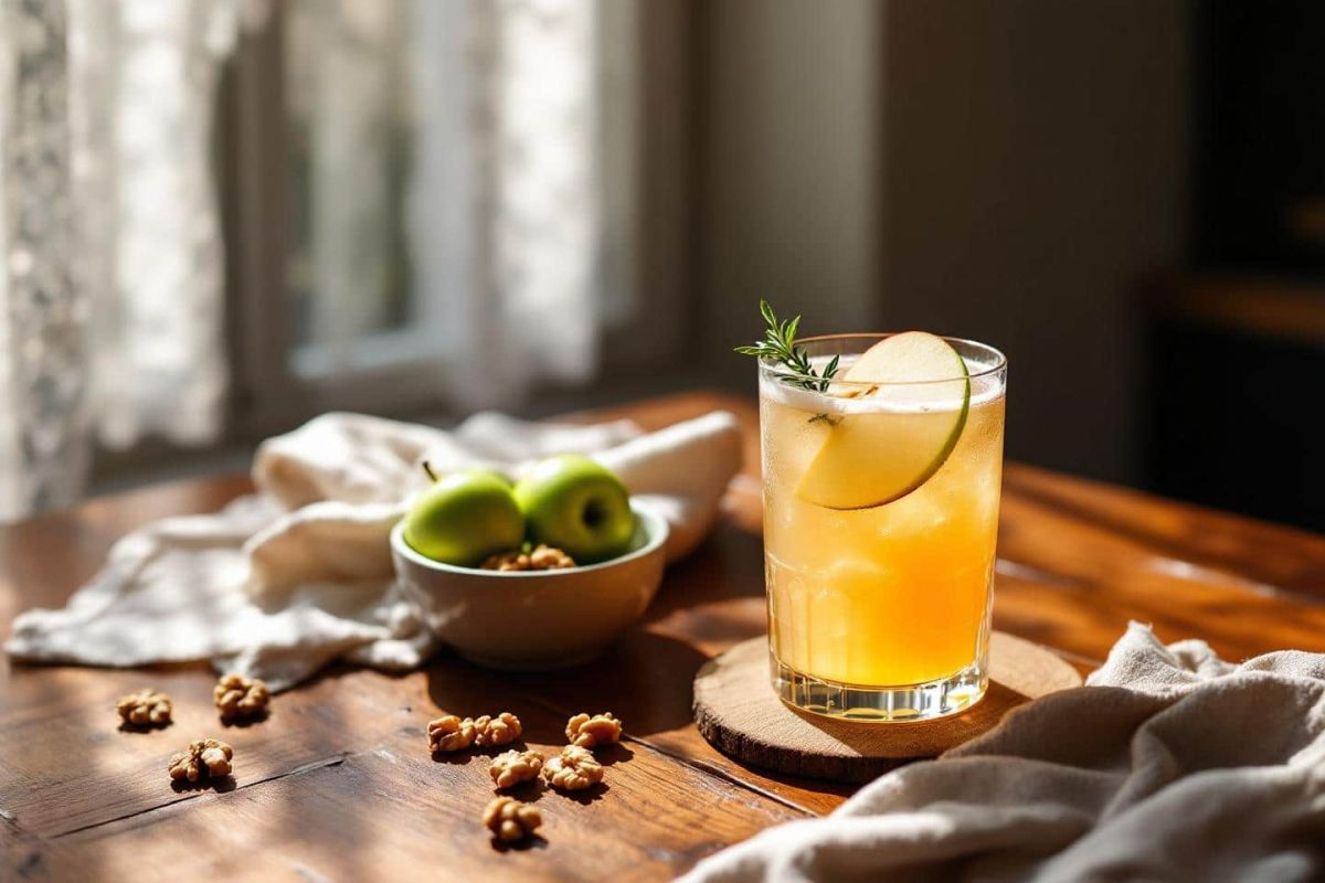 La présentation joue un rôle clé. Ajoutez une fine tranche de Granny Smith sur le rebord du verre, parsemez de quelques éclats de noix et ajoutez une fine lamelle de citron confit. Évitez les éléments trop extravagants : privilégiez une décoration qui sublime les saveurs authentiques et subtiles du cocktail.