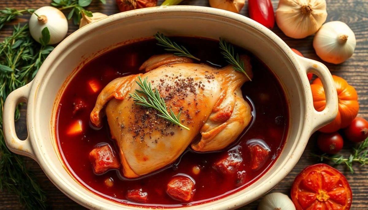 Plongez dans les saveurs de la cocotte de chapon au vin rouge, un plat qui enchante par ses arômes d'épices et de viande mijotée. Bien que souvent servi lors d'occasions spéciales, ce plat s'invite aussi facilement à votre table en semaine grâce à une préparation accessible et simple.
